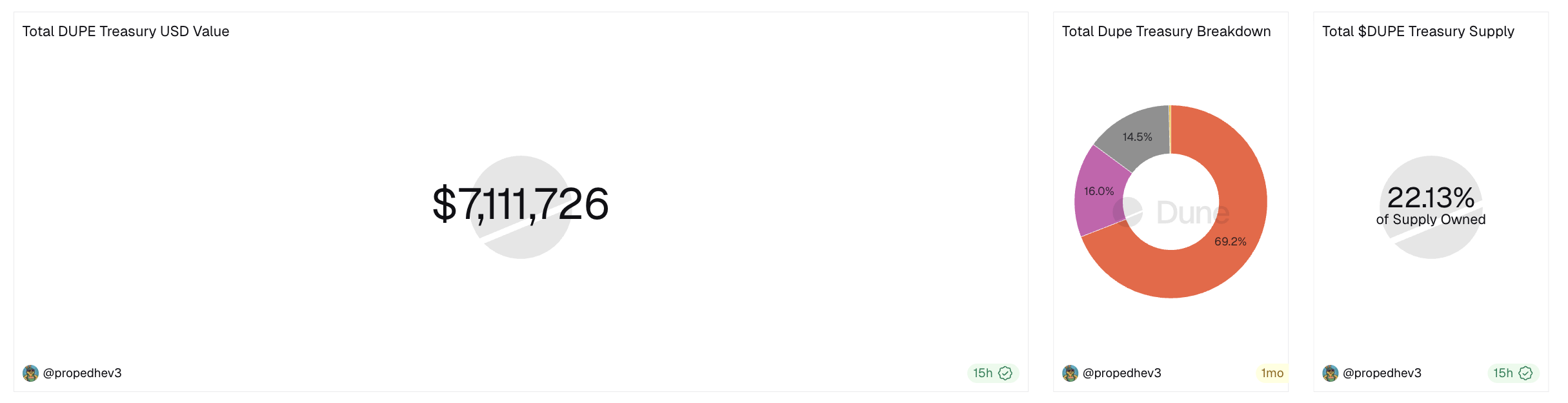 目前,交易员和投资者对该模型预期的价值增长持乐观态度。Dupe 团队声称已通过回购积累了超过 22% 的代币供应量,这一事实得到了证实。Dune Analytics 数据. $DUPE 代币销毁机制尚未纳入模型。