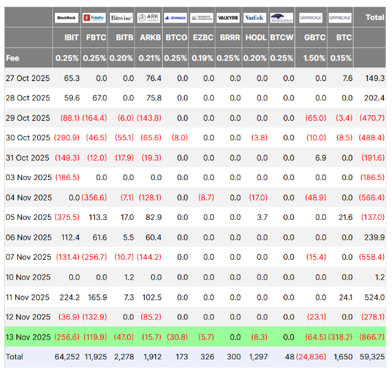 来自 Farside Investors 的报告显示,现货比特币交易所交易基金(ETF)周四录得约8.66亿美元的提款额,这一大幅波动发生在美国政府结束长达43天的封锁重新开放之后。关闭.