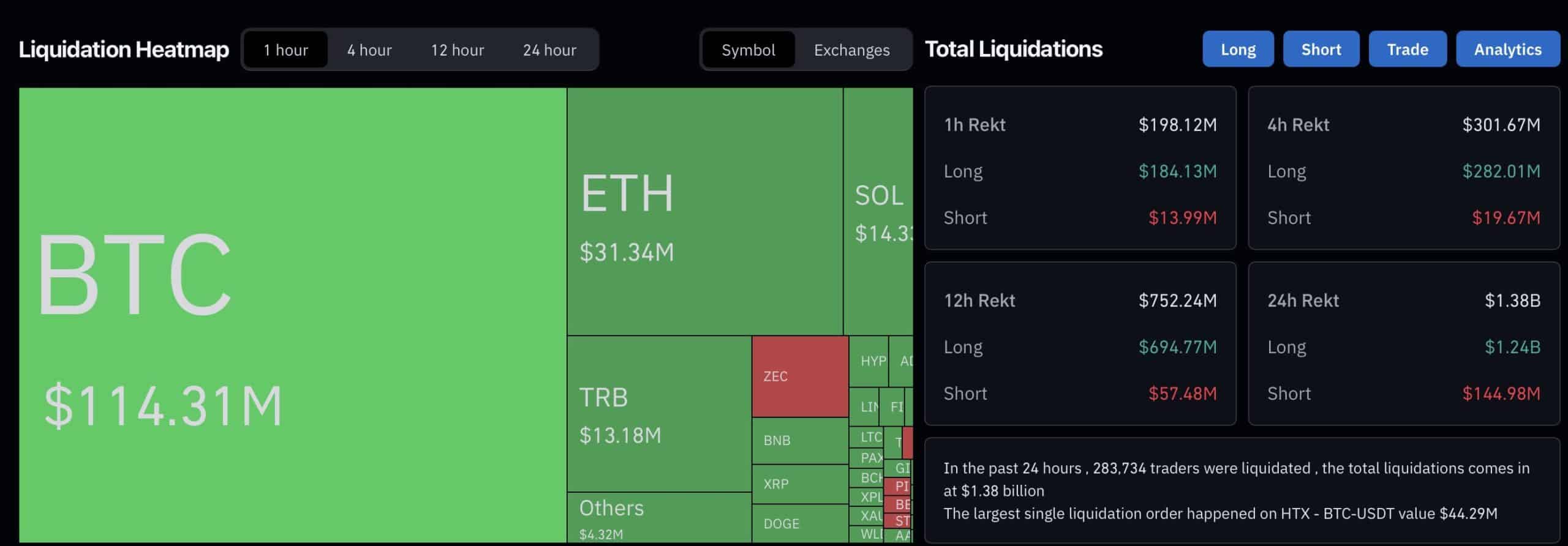 过度杠杆使情况雪上加霜。约9.6亿美元的仓位被强制平仓,其中包括8.27亿美元的比特币多头合约,引发了一连串的强制抛售。过去24小时内,强制平仓总额超过13.8亿美元。