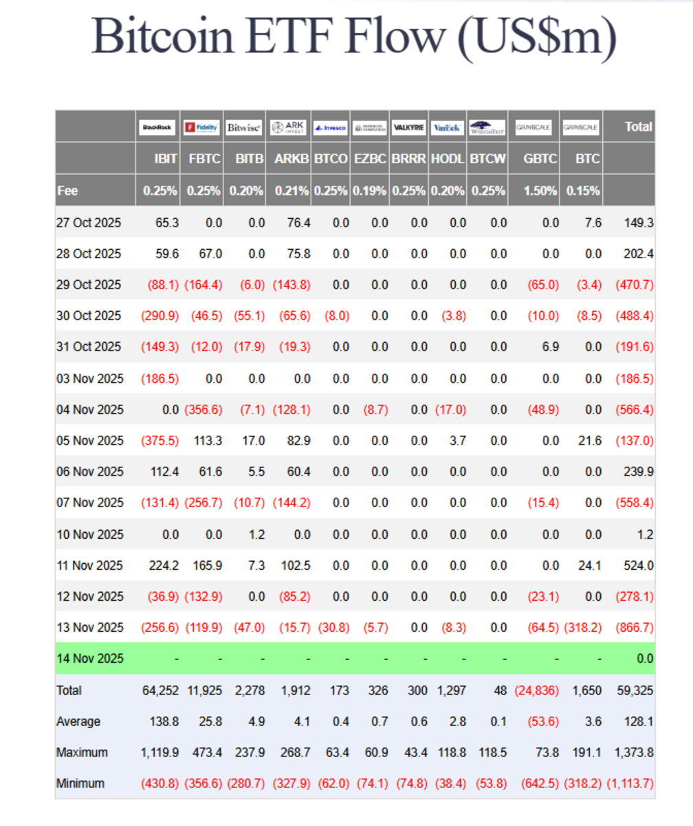 - 根据 Farside 的追踪器显示,截至 2025 年 11 月 13 日,比特币现货 ETF 录得约 8.667 亿美元的净流出。