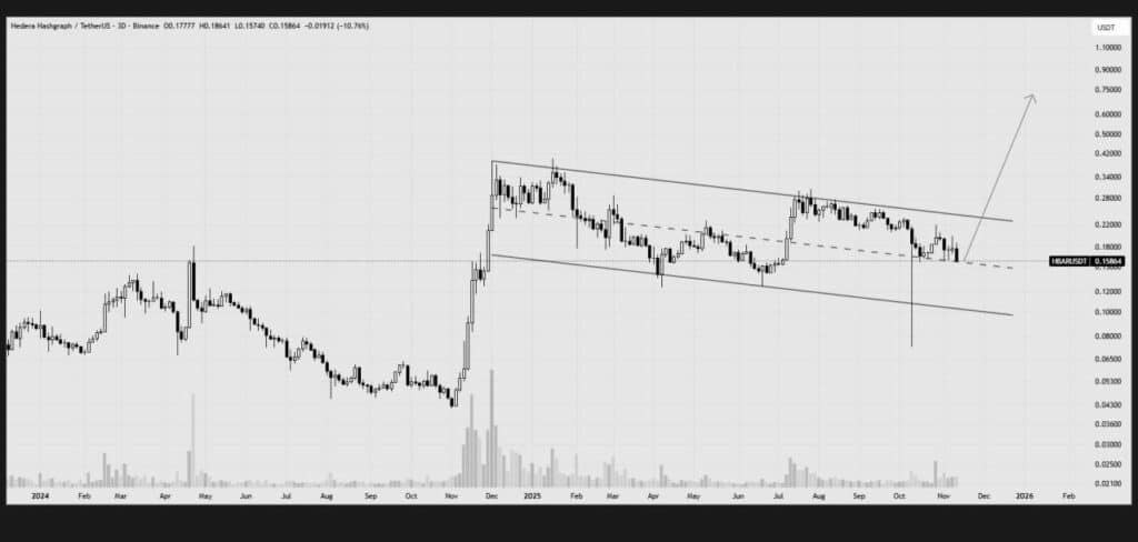 HBAR 的图表正在形成一个典型的下降通道形态,自 2024 年末以来,价格一直受到挤压,现在看起来即将爆发。HBAR 目前股价在 0.158 美元左右,下跌 10.76%,并且已经连续几个月在下方支撑线附近徘徊。有趣的是,每次测试底部时,它都会反弹。尽管图表表面看起来是看跌的,但显然下方存在强劲的买盘。