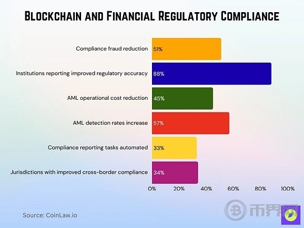 区块链对反洗钱流程的简化将运营成本降低了高达 45%,并将检测率提高了 57%。88% 利用区块链的金融机构报告称监管准确性得到提高。