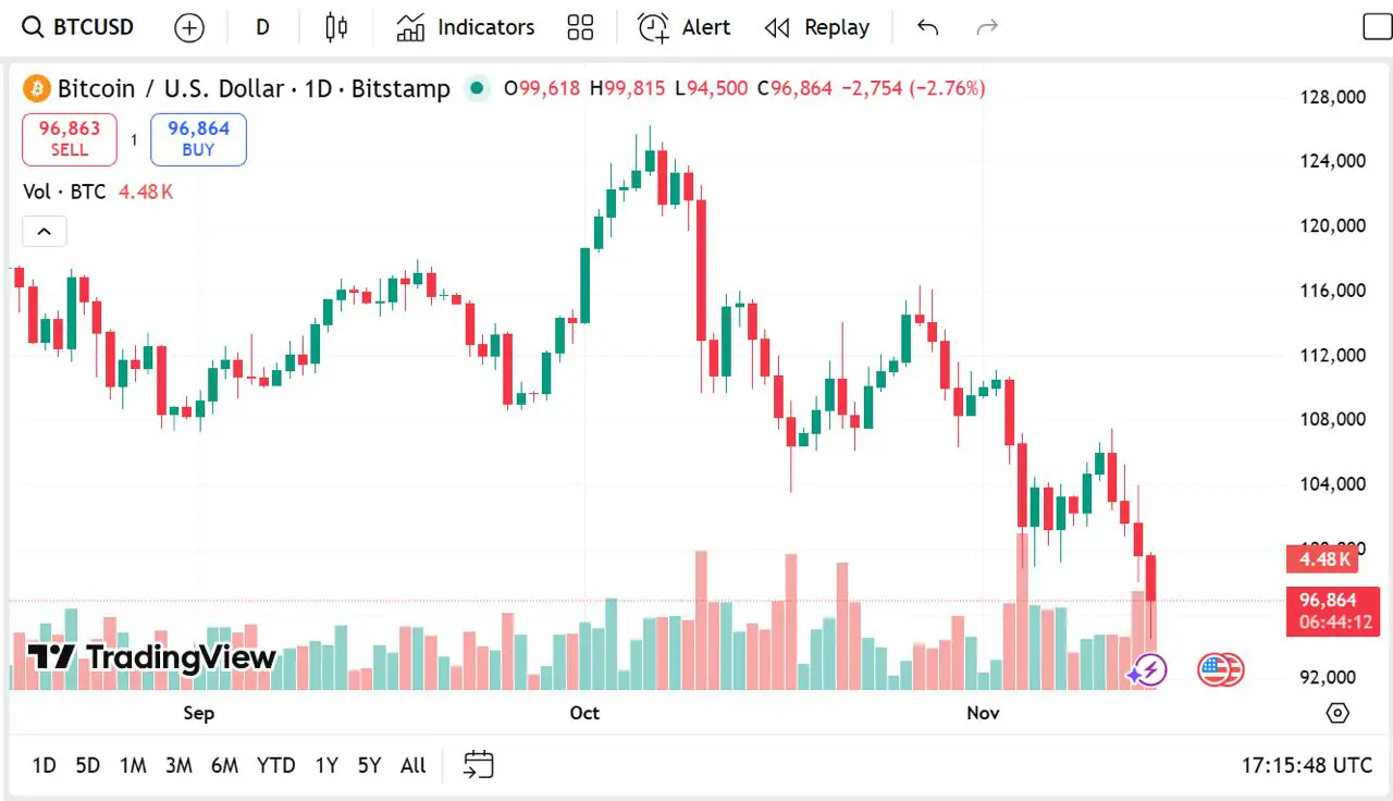 比特币目前交易价格为 96,863 美元,较前一日大幅下跌约 3.51%,市值约为 1.93 万亿美元。