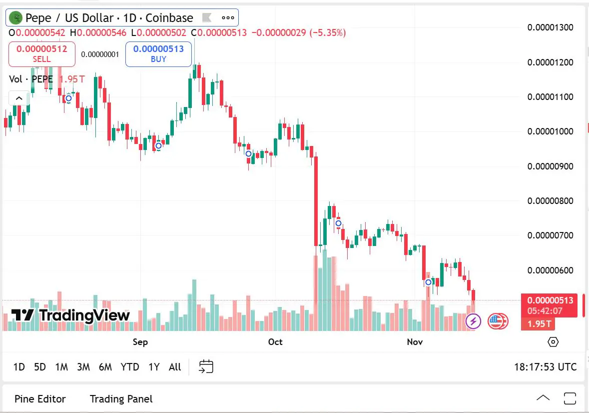 与此同时,Pepe币跌幅更大,目前交易价格为0.00000512美元,24小时内下跌了9.09%。其市值为21.2亿美元,交易量飙升91.21%至5.7905亿美元,波动性也随之加剧。