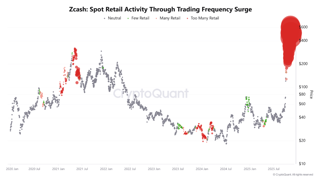 此外,CryptoOnchain 指出,ZEC 上涨行情的最后阶段目前主要由散户主导。现货零售活动指标中的“散户过多”信号已发出红色警报,这是市场达到顶峰时通常出现的典型信号。