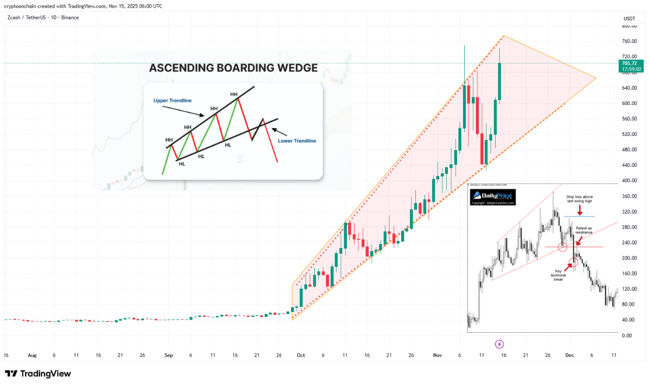 分析师表示,如果ZEC价格跌破楔形形态的支撑线,涨势可能会比新交易者想象的更快逆转。