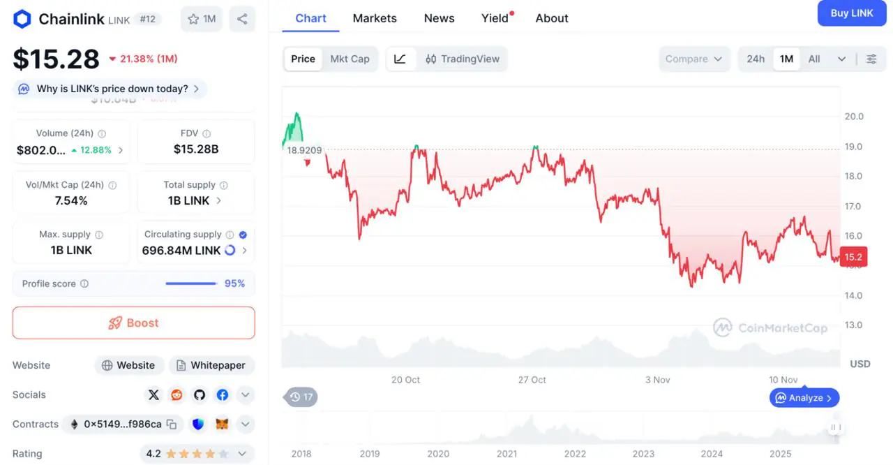 即便ETF催化剂即将到来,LINK超过105亿美元的市值也对其爆发式增长构成了相当大的限制。该代币需要跻身前五才能实现早期项目通常能够产生的回报。