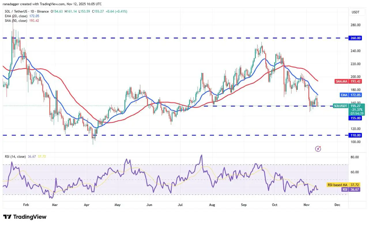 和 EMA11月12日,SOL股价在172美元附近触及下跌,目前卖方正全力冲击155美元附近的支撑位。如果该支撑位失守,SOL股价可能进一步下跌至126美元,甚至可能跌至更低水平。110美元抹去了数月的成果。多头需要重新夺回20日均线,并将价格推高至50日均线上方。简单运动抗体