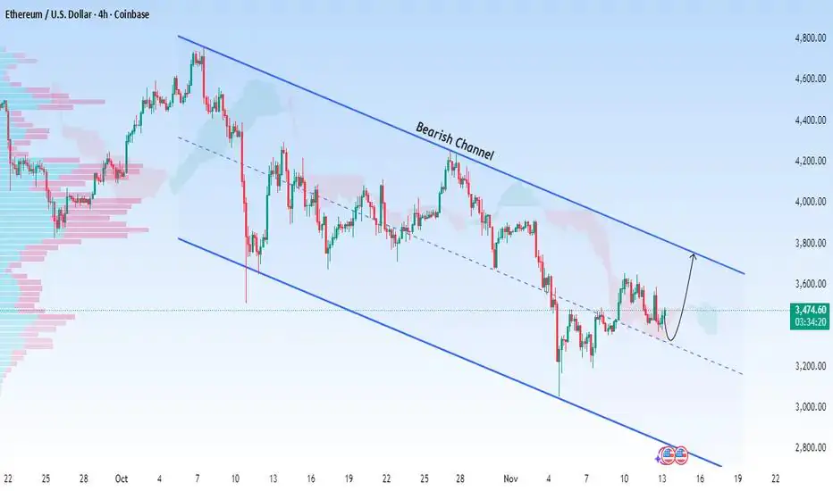 以太坊 (ETH/USD) 目前在 4 小时图上处于清晰的下跌通道内。价格近期从下轨反弹后,初步显示出短期上涨的迹象,有望向位于 3750 美元至 3800 美元区域的上轨趋势线迈进。