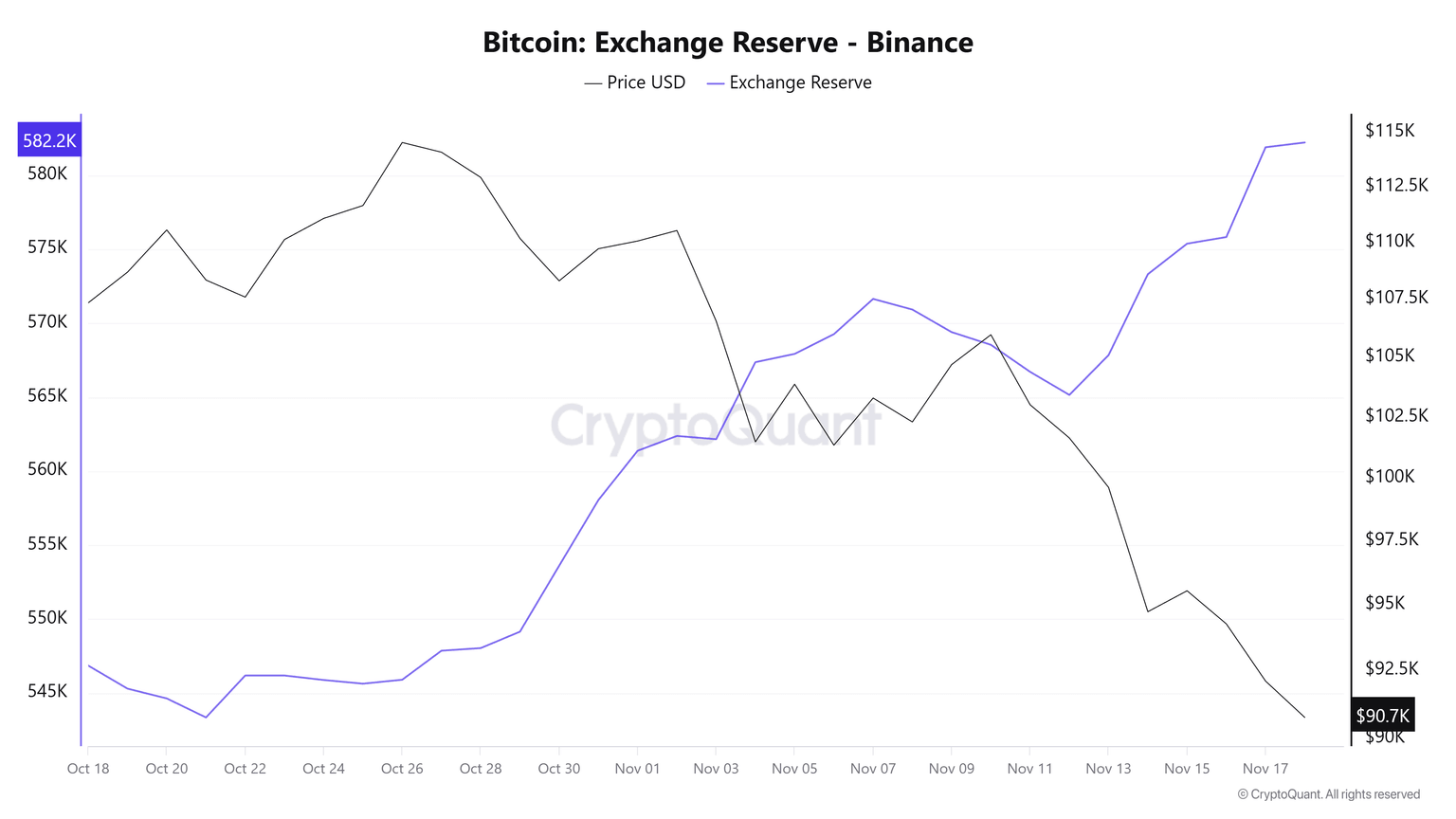 具体来说,币安(BTC流动性最高的交易所)的比特币储备从上个月的540,000 BTC增加到11月份的超过582,000 BTC。
