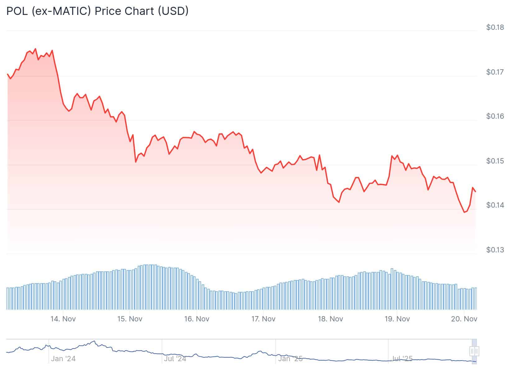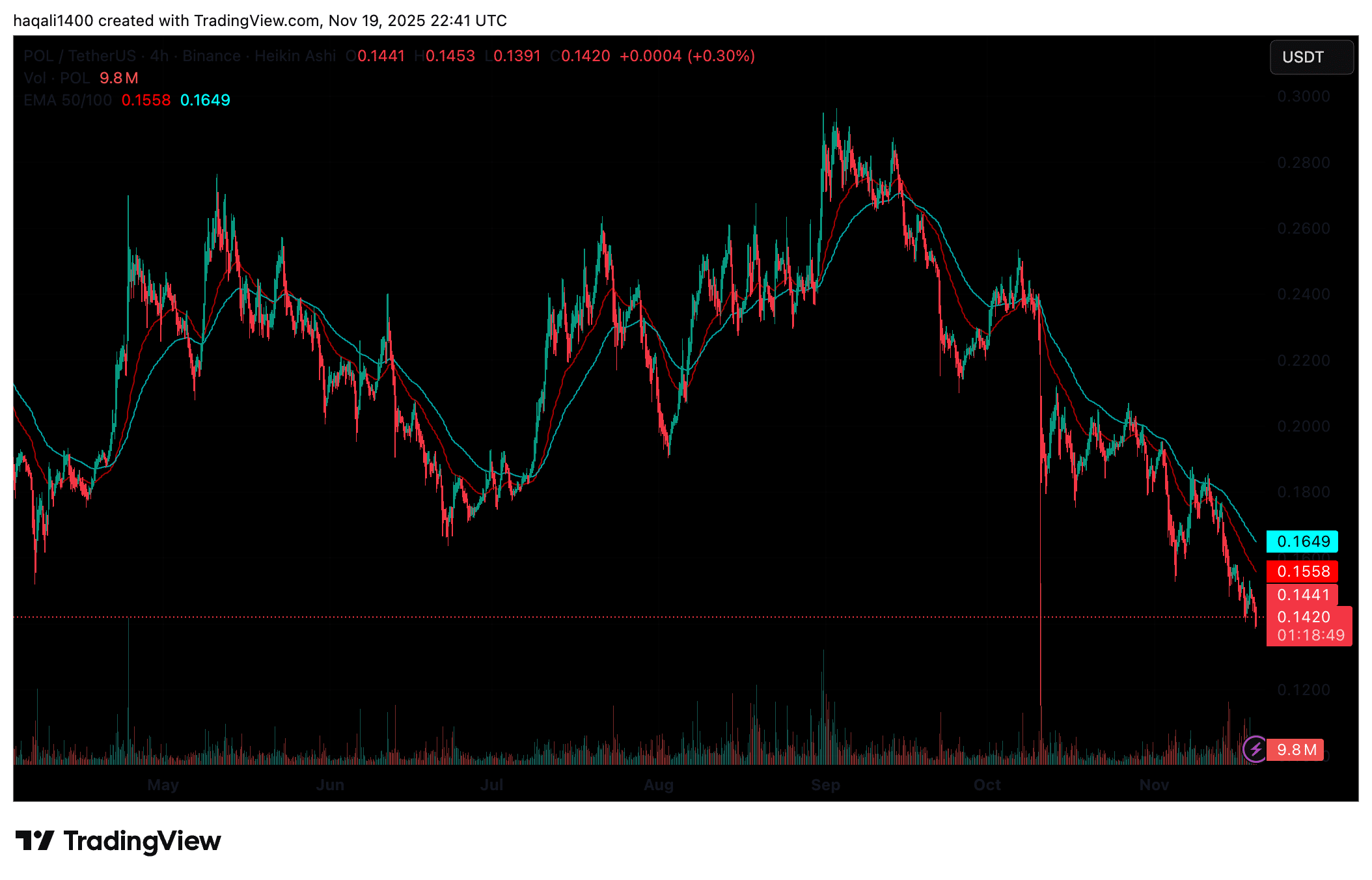 Pol 代币在整个夏季都在 0.18 美元到 0.28 美元之间波动。但这个支撑位未能守住。9 月下旬的下跌将代币推入了一个持续的下行通道,此后图表显示其走势几乎没有出现任何真正的停顿。