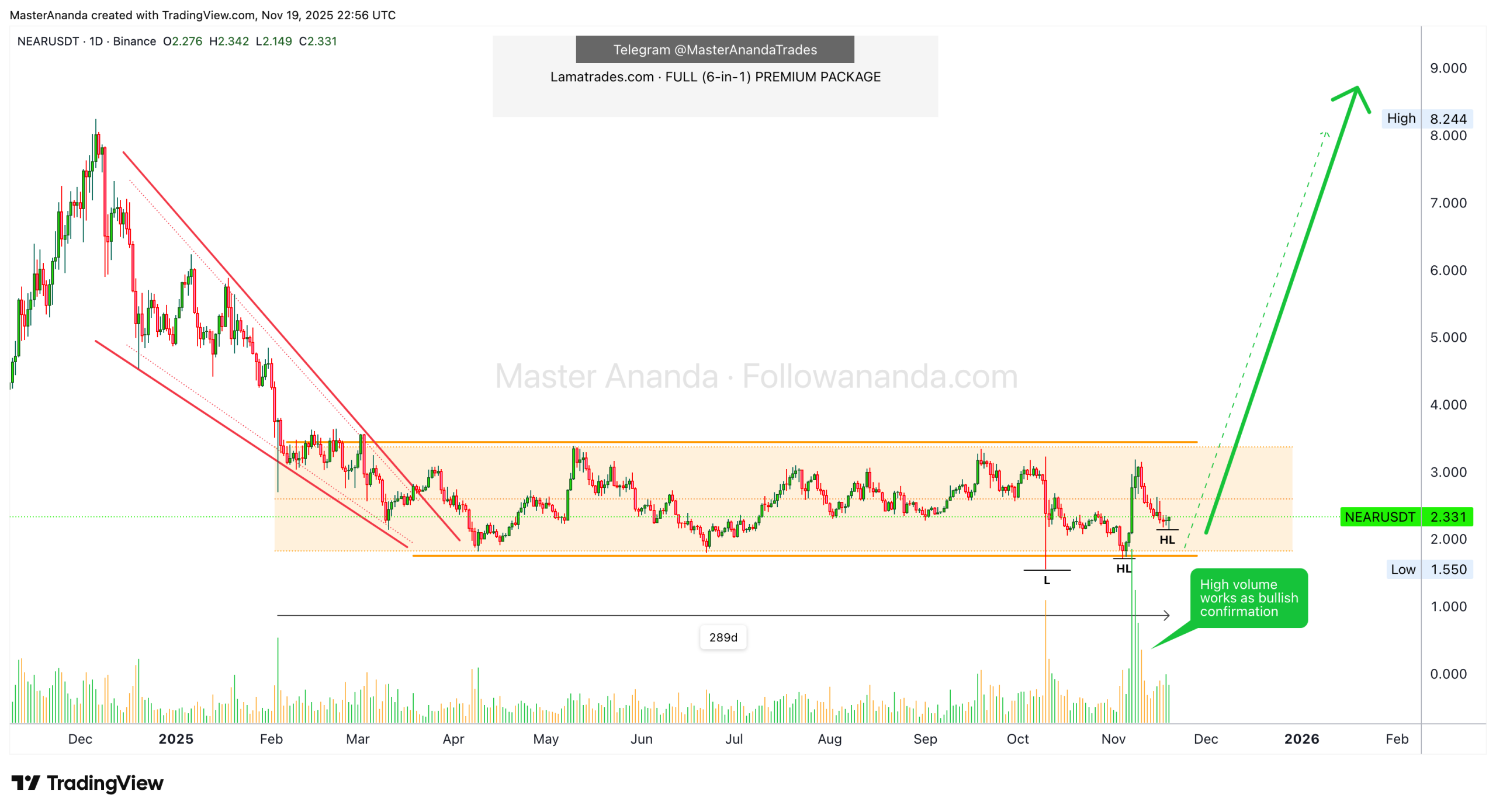 阿南达指出,NEAR此前在市场上涨期间触及低点,随后在11月4日创下更高的低点,现在又创下另一个更高的低点。这种形态看起来很整齐,但自年初以来,它仍然在同一通道内波动。