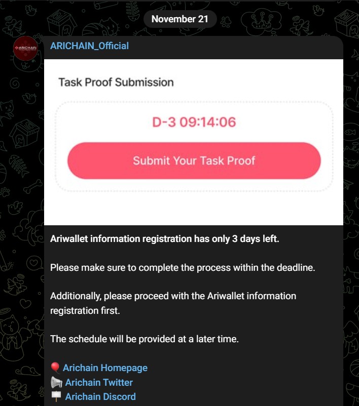 <!--[if ENDBLOCK]><![endif]--> <!--[if BLOCK]><![endif]-->Arichain 也紧急呼吁用户在三天内完成 AriWallet 信息注册。提交注册信息是获得下一轮空投福利的关键,因为福利会及时发放。