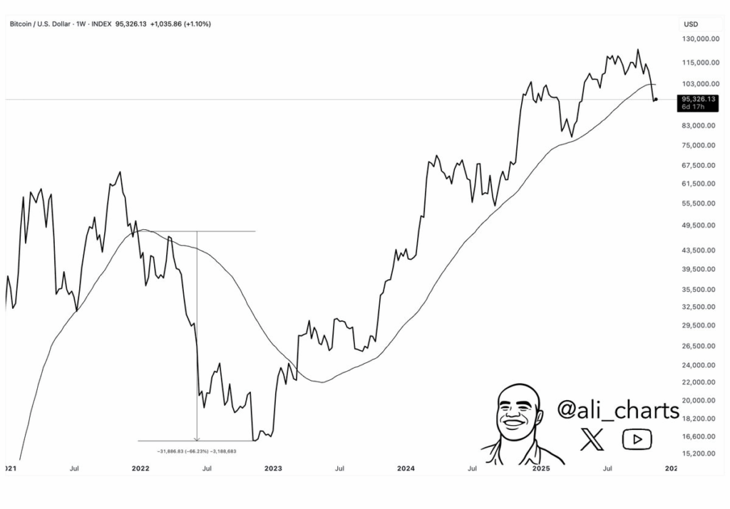 然而,尽管如此,分析师们仍发出谨慎警告。分析师阿里·马丁内斯(Ali Martinez)也表达了悲观情绪,他指出比特币价格已跌破50周均线,而此前比特币价格曾因此暴跌66%。
