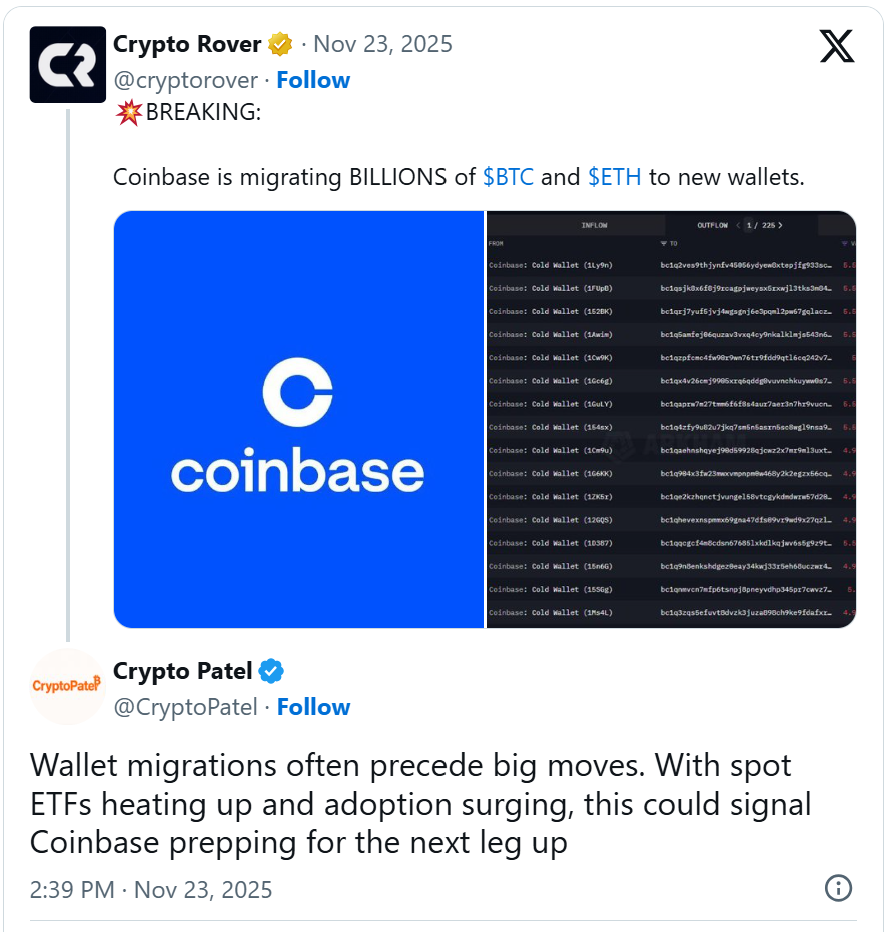 加密货币新闻:Coinbase交易所将BTC和ETH转移到新钱包