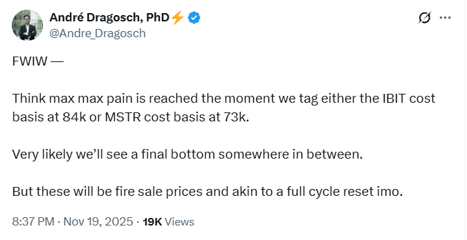 他表示,当价格达到 IBIT 成本基准 84,000 美元或 MSTR 成本基准 73,000 美元时,市场可能会感受到最大的压力。