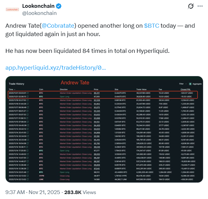 随着价格波动加剧,更多巨鲸级交易者遭遇损失。Lookonchain 报道称,Andrew Tate 在 Hyperliquid 平台上再次开立比特币 (BTC/USD) 多头头寸,并在不到一小时内再次被强制平仓。