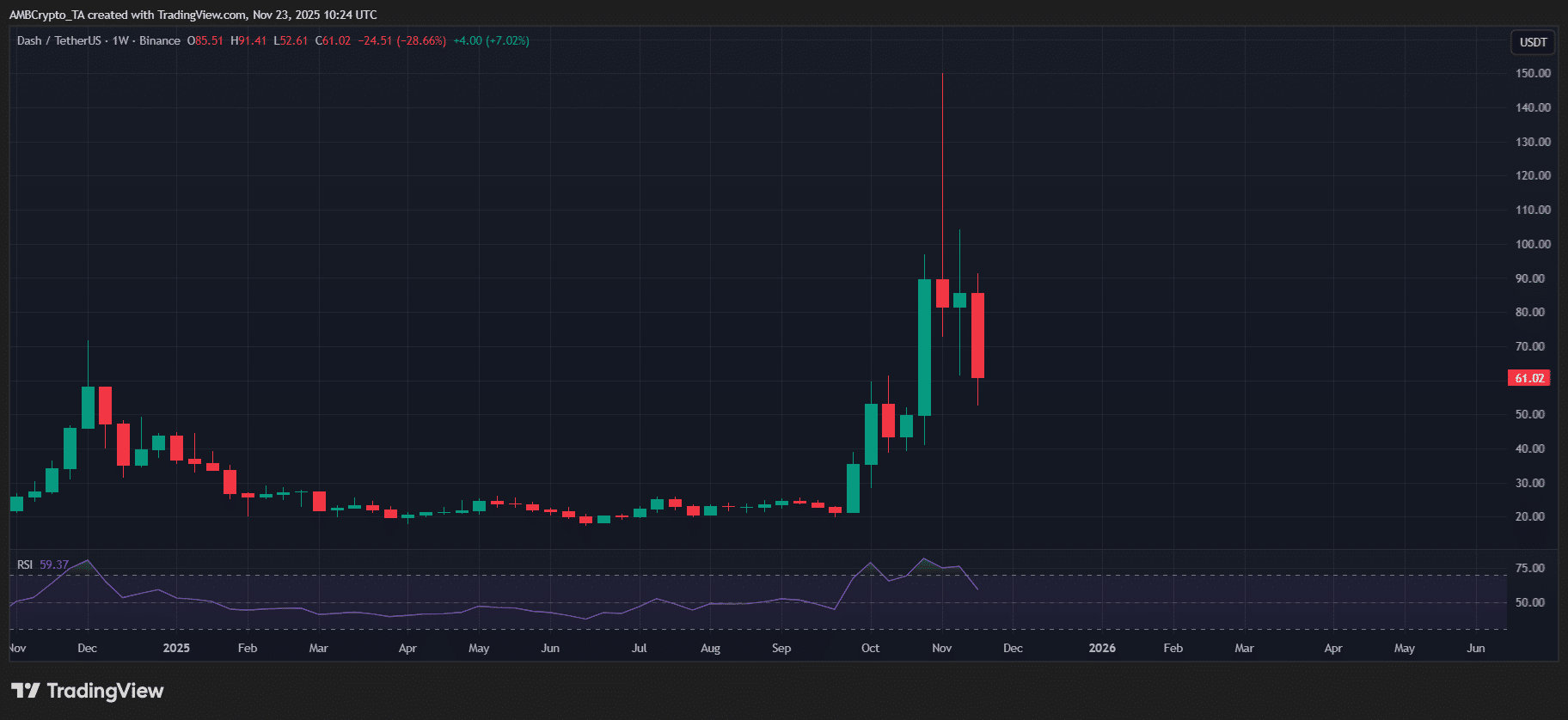 Dash [DASH]本周跌幅居前,跌幅达28%,在跌破70美元阻力位后,抹去了超过75%的月度涨幅。周线RSI指标显示,市场明显过度扩张。