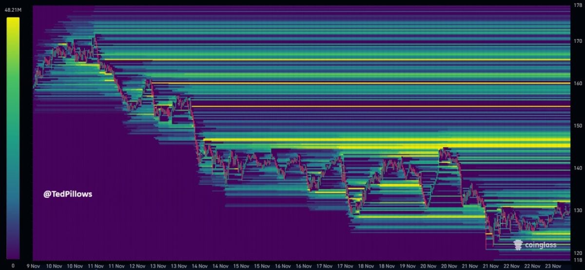 加密货币市场分析师泰德·皮洛斯著名的Solana的大部分下行流动性已被释放。分析师表示,目前145美元至150美元区间仍存在大量流动性,120美元附近也是一个值得关注的区域。