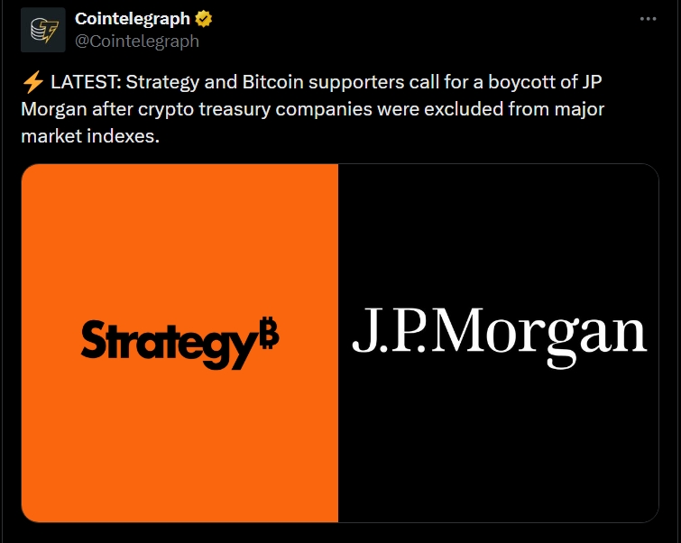 摩根大通在推进其最新市场指数更新,将比特币排除在外后,面临比特币抵制上诉。此举引发了强烈批评。加密货币投资者认为,这一决定削弱了透明度,并表明了对数字资产的过时态度。