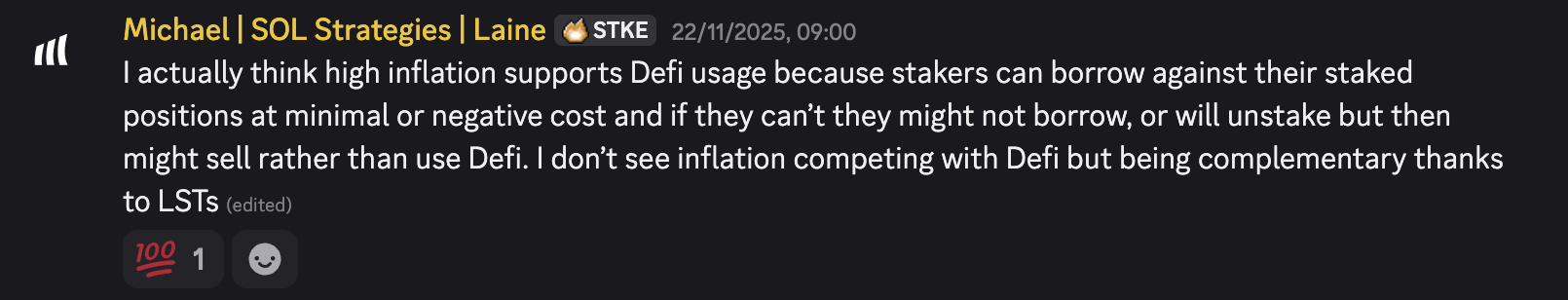 尽管Solana的大多数开发者都表示支持SIMD-0441,但一些验证器运营商仍然对其必要性表示担忧。Sol Strategies的Michael Hubbarb在Solana技术Discord服务器上发言称,更高的质押率能够促进更高效的DeFi策略,并认为降低通胀率可能会损害Solana DeFi的使用。