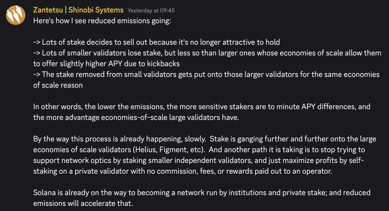 Shinobi System 的 Zantetsu 认为,加速通缩曲线可能会导致权益集中到 Helius、Figment 和 Kiln 等大型的、具有“规模经济”的验证者身上,Kiln 是一家以……而闻名的运营商。故意拖延区块生产方面,Zantetsu表示担忧,Solana正在逐渐成为机构投资者和私人权益运营商的试验场,而随着排放量的减少,这种转变只会加速。