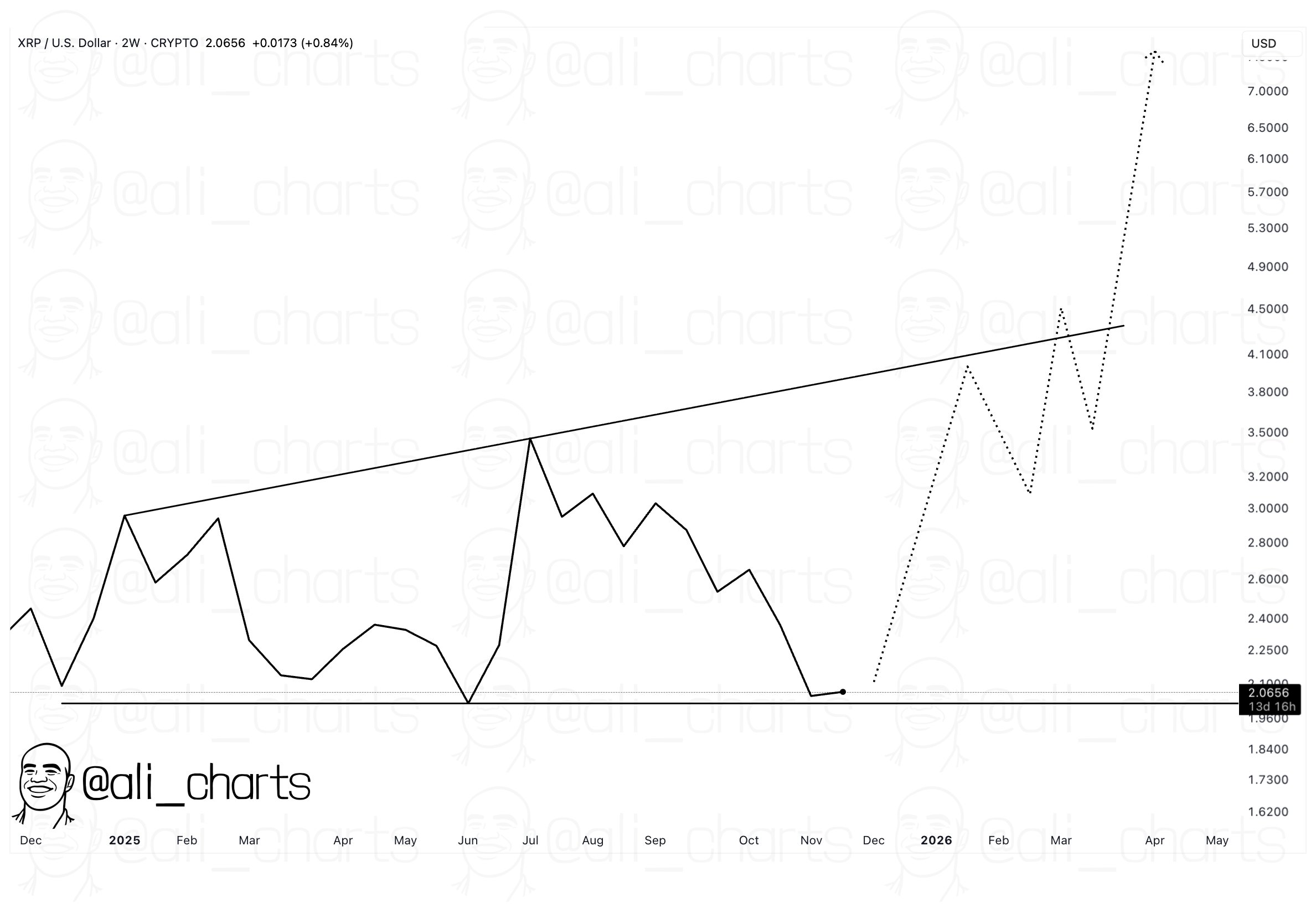 图表显示,12 月是该模式确认或崩溃的关键节点,因为……XRP价格已经多次触及 2 美元的关口而没有跌破,仅凭这一点就足以证明看涨的理由成立。