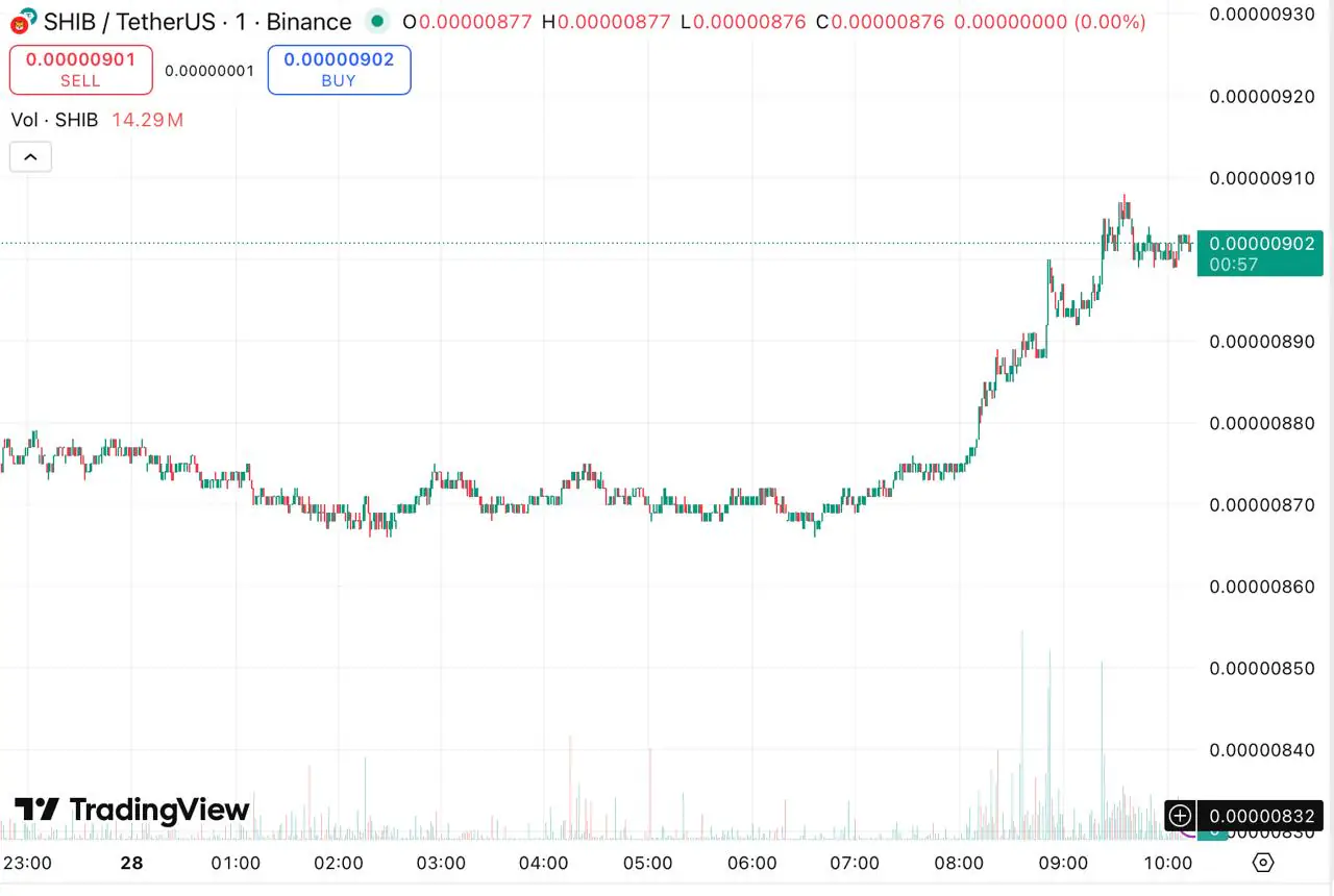 SHIB 突破长期下降趋势线并上涨至约 0.00000863 美元,显示出新的上涨动能。在 0.000007 美元附近的盘整突破表明抛售压力可能正在减弱。