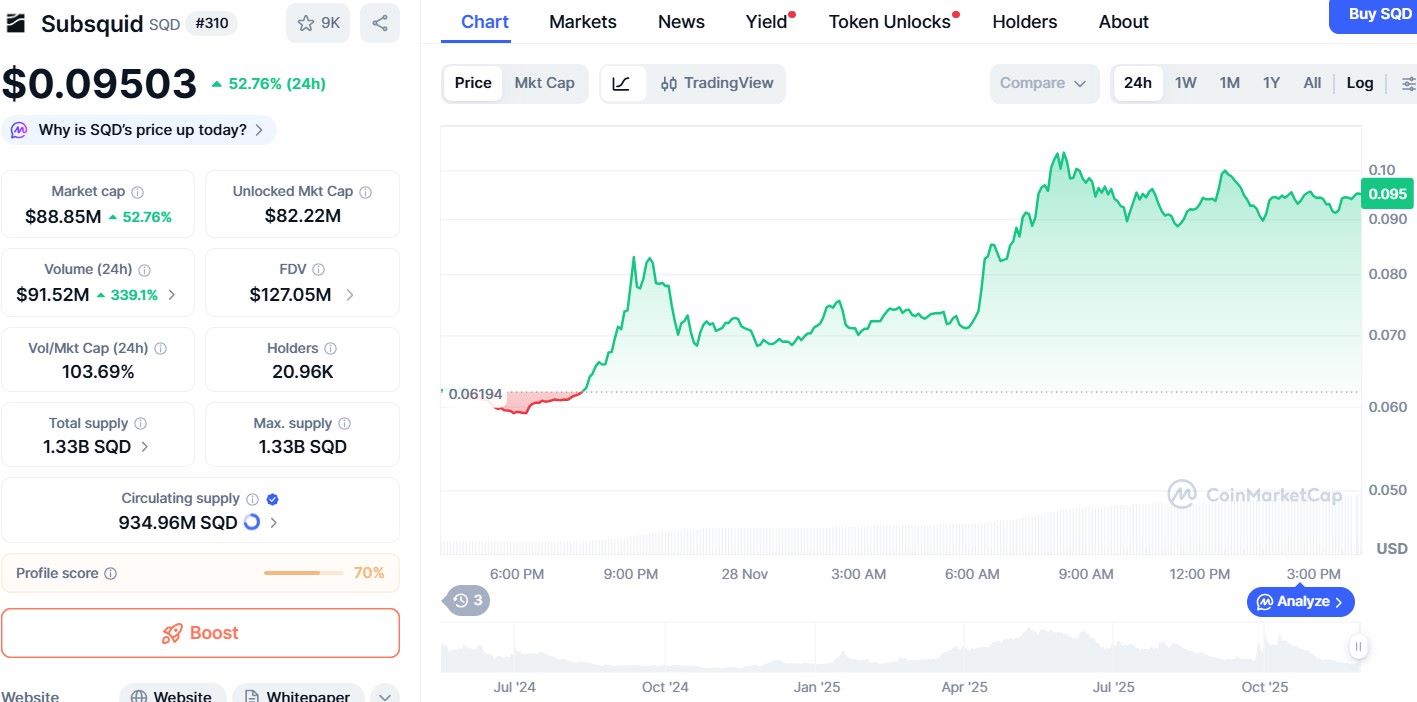 Subsquid 价格走势图显示,该资产开盘价接近 0.0619 美元,并迅速飙升至 0.10 美元附近。目前价格约为 0.095 美元,创下市场单日涨幅最强劲的纪录之一。