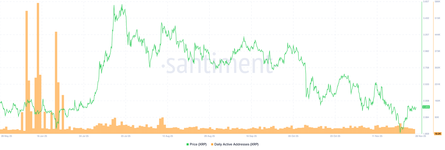 过去几个月,XRP 分类账 (XRPL) 的链上活动一直处于显著低迷状态。根据 Santiment 的数据,自 6 月以来,该网络的日活跃地址数从未超过 10 万个。
