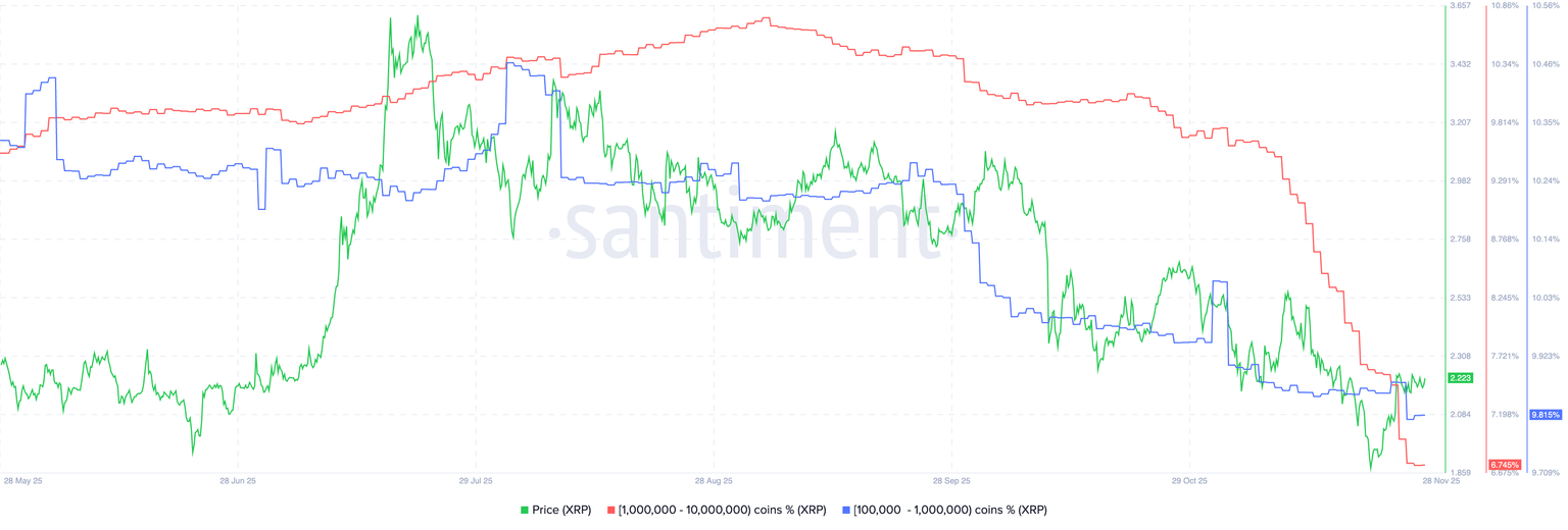 与此同时,大额投资者(也被称为“鲸鱼”)继续抛售 XRP,进一步加剧了抛售压力。下方的供应分布指标显示,持有 10 万至 100 万枚代币的投资者群体(蓝线)目前占总供应量的 9.81%,低于 11 月 1 日的 10.06% 和 9 月 4 日的 10.21%。