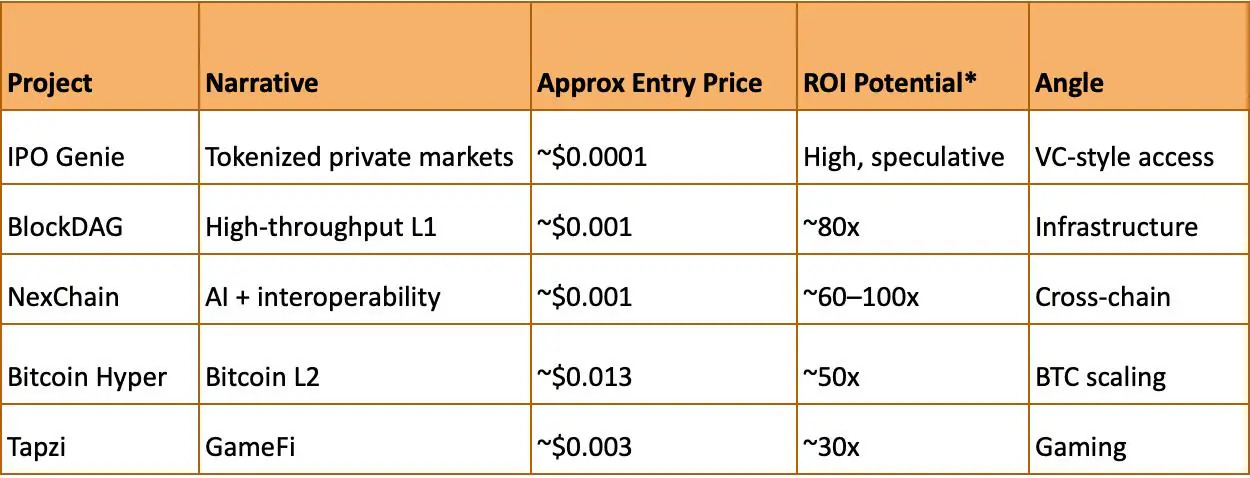早期投资项目有望获得高估值倍数,但前提是必须具备真正的实用性、强大的执行力以及长期的应用前景。IPO Genie 的优势在于它结合了私募市场准入、结构化的代币经济模型以及清晰的需求信号。其他项目则涵盖基础设施、人工智能、规模化和游戏领域。