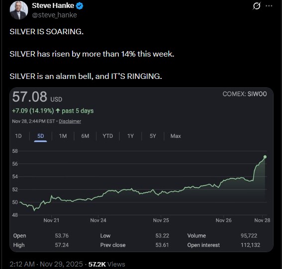 今日白银价格创下历史新高,此前白银价格在短短七天内上涨了14%。史蒂夫·汉克一位著名的加密货币分析师和经济学家。此次突破表明市场对硬资产、避险金属和通胀对冲工具的需求强劲。