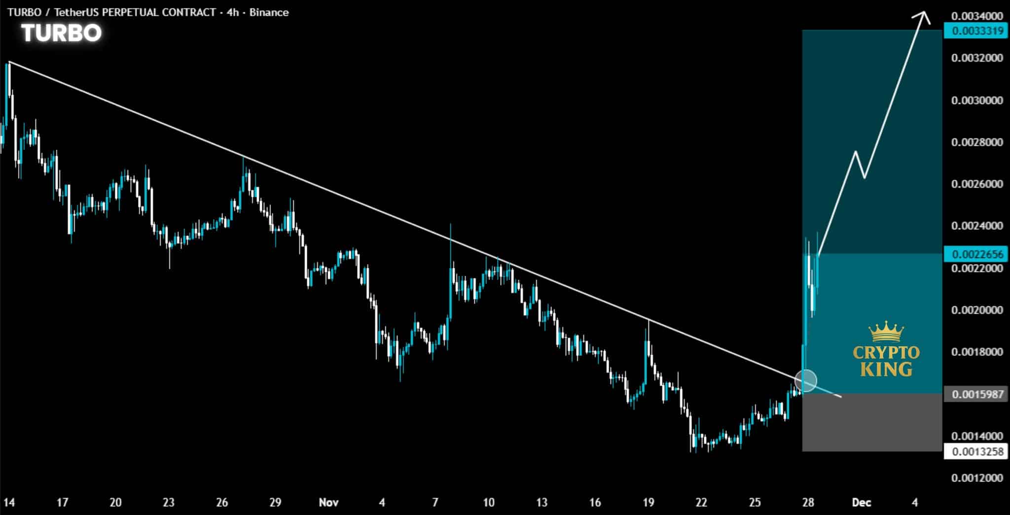 与此同时,TURBO 在币安交易所的四小时图表上显示出技术性转变。价格突破了一条下降趋势线,该趋势线在 11 月的大部分时间里都阻碍了价格上涨。