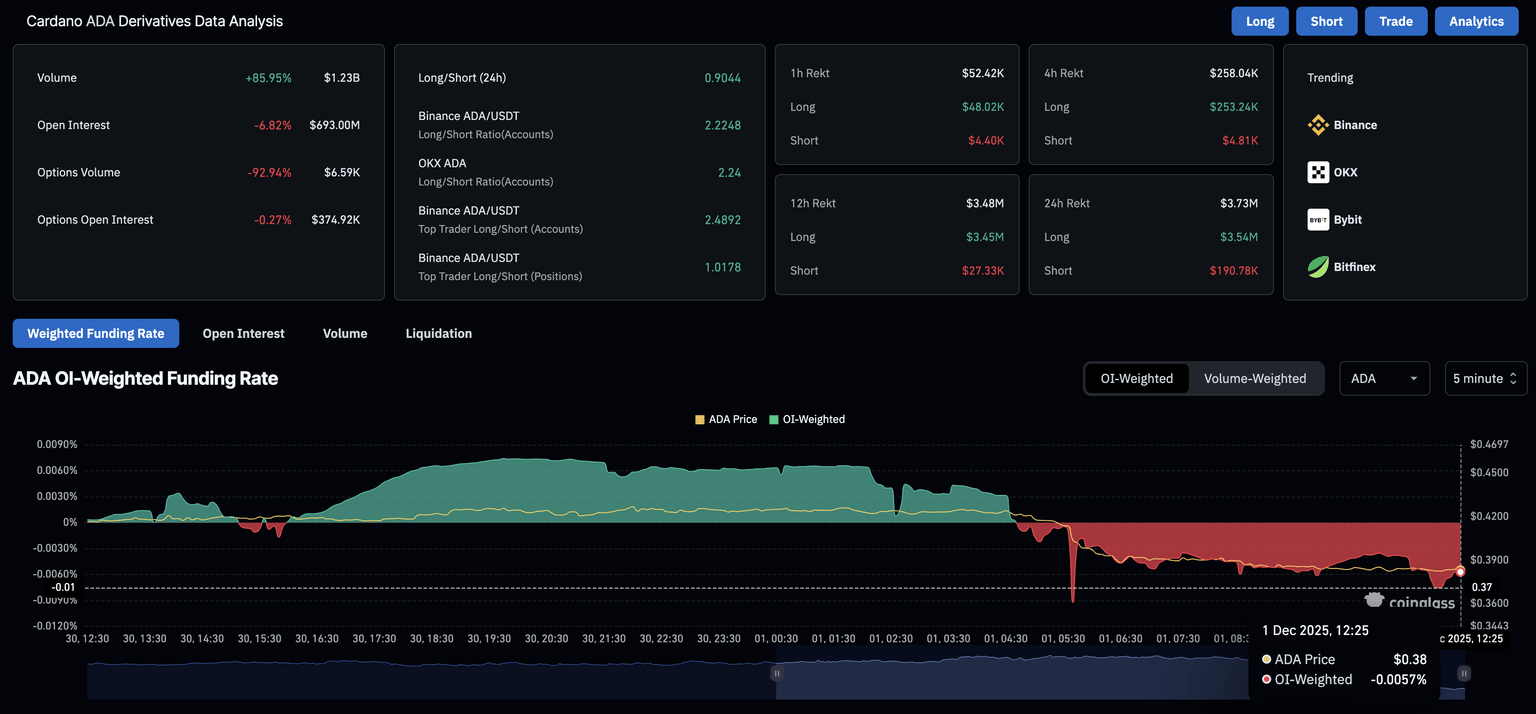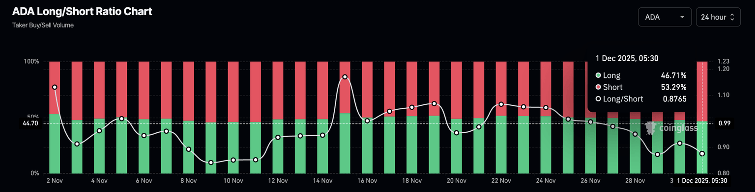 随着抛售增加,多空比达到0.8765,过去24小时内空头头寸占所有衍生品合约的53.29%。这表明,由于交易员预期ADA价格将进一步下跌,卖方在Cardano衍生品市场占据主导地位。