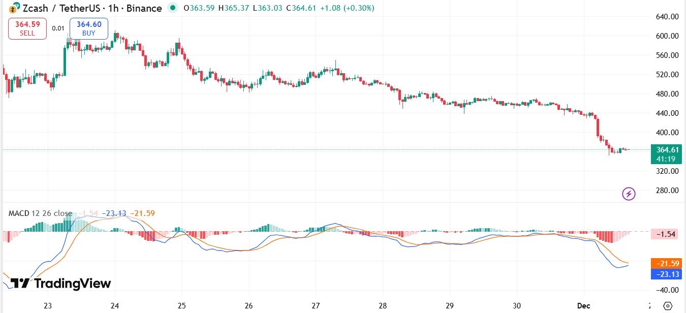 过去一周,Zcash 的价格下跌趋势明显。TradingView图表显示出更低的高点和更低的低点,这种模式通常表明抛售压力很大。