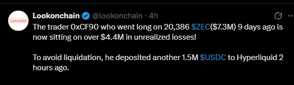 Zcash 价格突然暴跌的最大原因之一是一笔巨额杠杆交易出了问题。根据 Lookonchain 的说法据知名区块链分析平台报道,就在九天前,钱包地址为 0xCF90 的交易员做多 20,386 个 ZEC,价值 730 万美元。