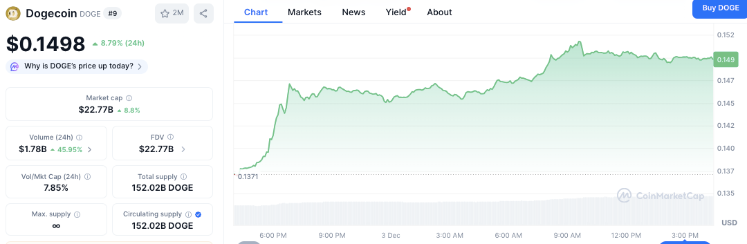 è¿å»24å°æ¶å ï¼ççå¸å¸åºè¡¨ç°å¼ºå²ï¼ä¸æ¶¨8.79%è³0.1498ç¾å ï¼å¸å¼å¢è³227.7亿ç¾å ãè¯¥ä»£å¸æ¨æ¥æäºæ¶åä»0.137ç¾å åºé´èµ°é«ï¼çªç ´0.147ç¾å ï¼å¹¶å¨ç¾å½æ©ç交æä¸ç¨³å®å¨0.149ç¾å éè¿ã