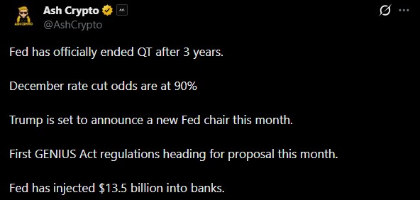与此同时,市场普遍预期降息——大约88-90%的概率美联储预计将在12月中旬降息。较低的利率和流动性的恢复通常有利于比特币、以太坊和其他加密货币。