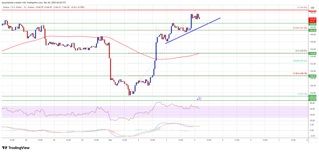 Solana 目前交易价格高于 140 美元,并高于 100 小时简单移动平均线。此外,SOL/USD 小时图上正在形成一条上升趋势线,支撑位在 143 美元附近。