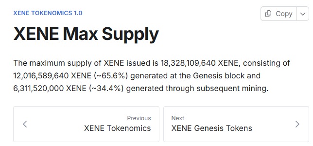 尽管总供应量已知,但代币的完整分配模型尚未完全公开。XENE 的最大供应量上限为 18,328,109,640 枚。其中约 65.6% 在创世区块中生成,剩余的 34.4% 将通过挖矿逐步释放。