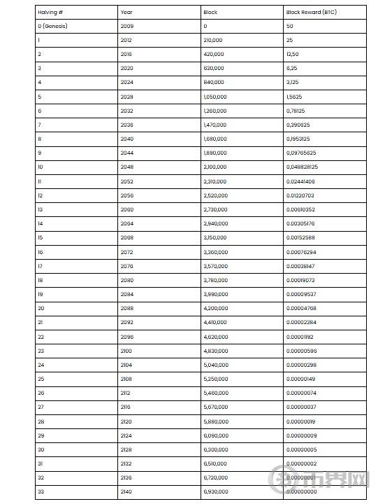 由于每次减半降低奖励但挖矿仍维持约每 10 分钟一个区块的速度,比特币供给将以涓流速度缓慢释放,直至触及 2100 万枚上限,因此时间线将延续至 2140 年。