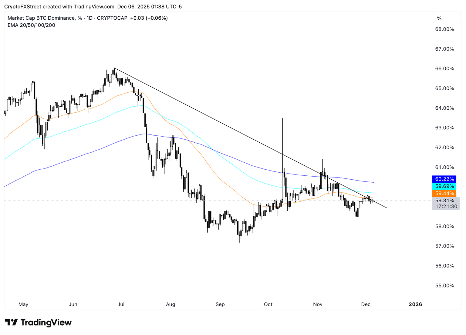 比特币市值占比衡量的是比特币(BTC)相对于其他代币(包括山寨币)在市场上的重要性。随着比特币市值在12月6日跌至1.79万亿美元,比特币市值占比也在下降。截至撰写本文时,比特币市值占比已低于60%,为59.31%。