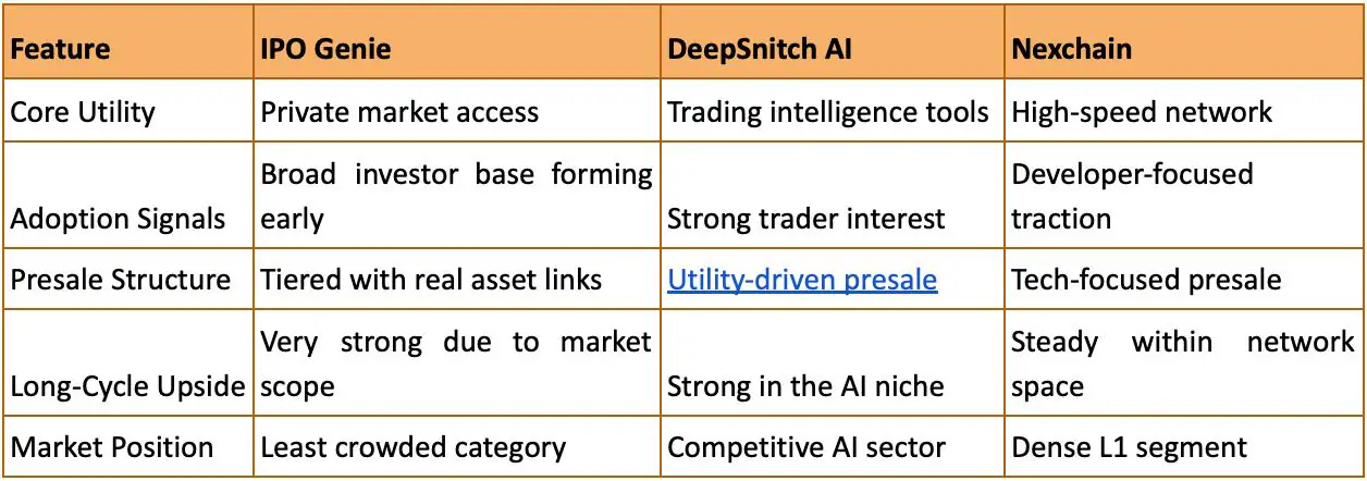 人工智能驱动的预售模式受益于机构日益增长的关注。私人市场访问代币吸引着寻求新型资产类别的投资者。当开发者从炒作转向实际表现时,网络项目就能从中受益。这三个项目分别符合上述三种情况之一。IPO Genie 因其稳健的基本面和可扩展、易于推广的架构而脱颖而出,这也是为什么许多投资者现在将其视为……顶部 加密货币 预售2026年DeepSnitch凭借其可操作的情报工具排名靠前。Nexchain凭借其技术交付和早期市场表现,仍然是稳健之选。