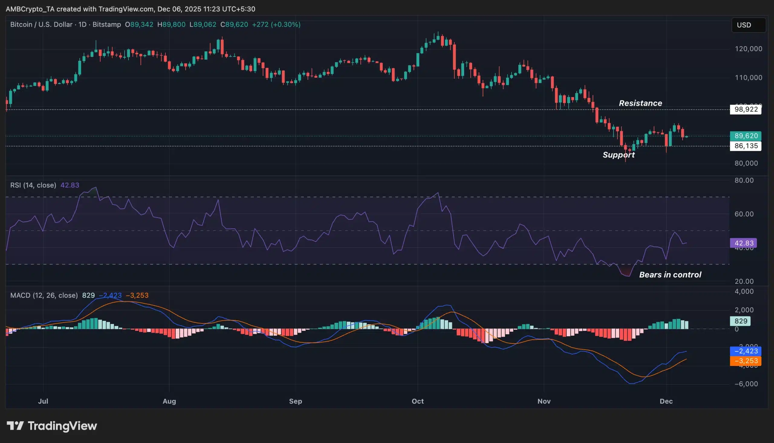 截至撰稿时,BTC 的相对强弱指数 (RSI) 和移动平均收敛/发散指标 (MACD) 均低于其中性水平,证实了短期至中期内抛售动能的主导地位。