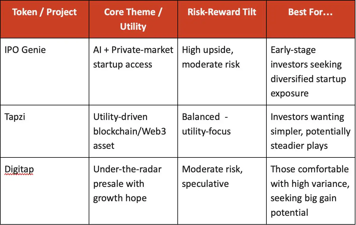 重新审视 2025 年第四季度最热门的加密货币预售。首次公开募股 Genie 领衔三大高潜力项目,Tapzi 和 Digitap 紧随其后。