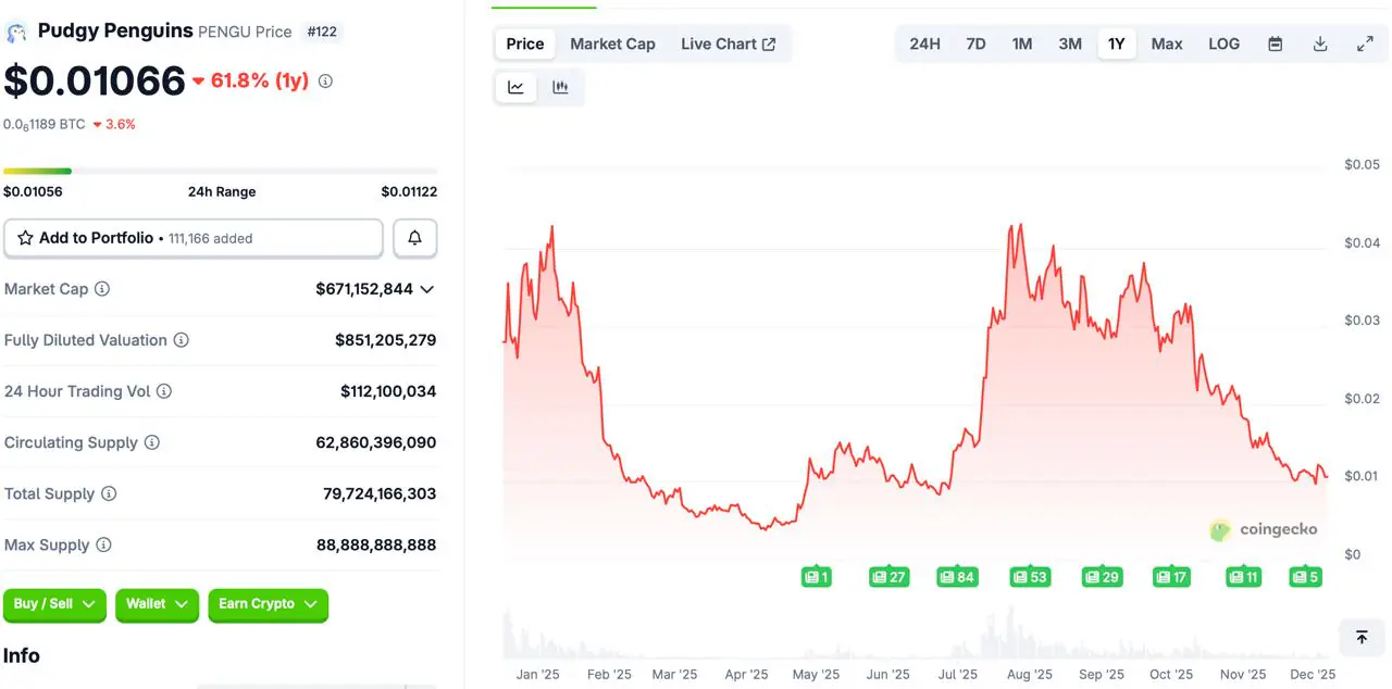 年中强劲突破后,PENGU价格回落至0.03-0.04美元的阻力区域,但多次受阻表明抛售压力巨大,多头动能减弱。从夏末到初秋,图表显示一系列更低的高点,表明卖方逐渐占据主导地位,并转入持续下跌趋势。到11月,价格回落至关键的0.01-0.015美元支撑区域,标志着年中反弹的完全回落。此轮下跌期间的交易量相对清淡,表明价格呈现逐步派发而非投降式抛售的态势。总体而言,PENGU的年度走势表明市场已完成一个完整的繁荣与萧条周期,当前价位代表长期支撑,但尚未形成确认的反转形态。