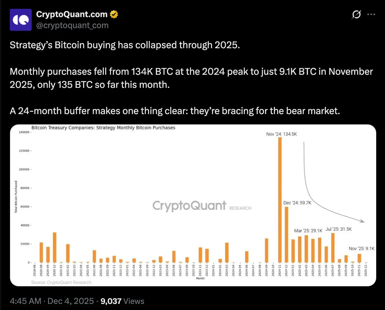 据一份详细报告显示,全球最大的比特币企业持有者Strategy大幅减少了其每月比特币购买量。CryptoQuant数据显示,比特币持有量从2024年底的峰值13.4万枚缩减至11月份的9100枚。本月迄今为止仅记录到135枚比特币,分析师认为这是加密货币国库市场为长期低迷做准备。