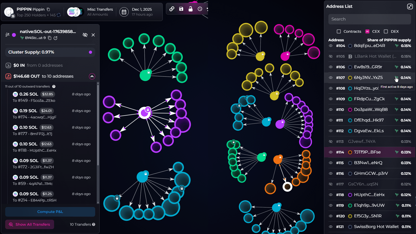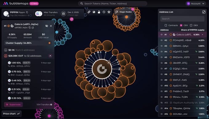 12 月 2 日,BubbleMaps 标记了额外的活动,揭示了 26 个地址在过去两个月内从 Gate 提取了所有 PIPPIN 的 44%,总价值达 9600 万美元。