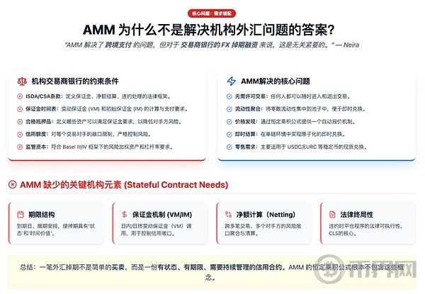 AMM解决的是无需许可交易和流动性聚合,机构要的是信用管理、监管合规和结算安全——两套需求几乎没有交集